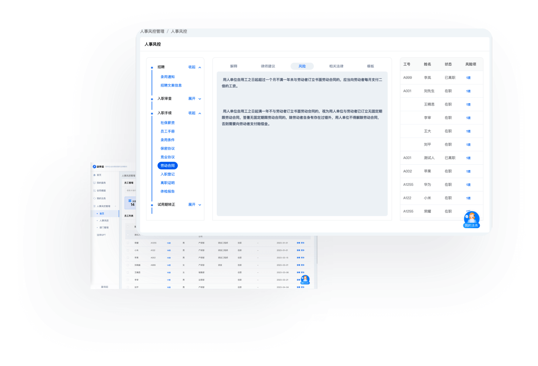 人事风控系统可以根据员工的入职信息快速筛选出员工的风险项,提前预知用工风险,并给出修改建议,并持续进行入转调离全流程的监控和跟踪